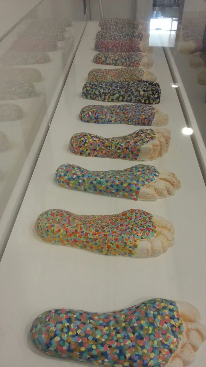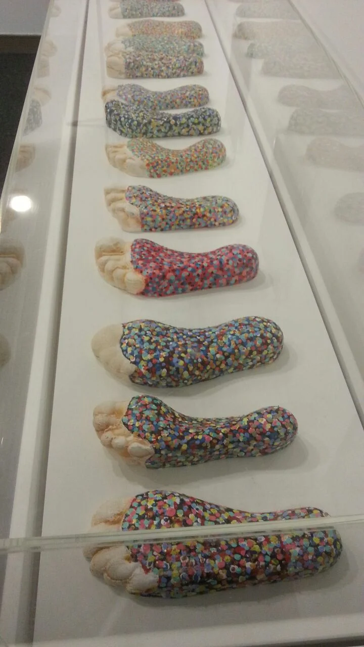 This work considers the subject of“The Last Supper” from a different angle. Christ in this work is represented by a foot which is completely painted ( spiritually complete) where as the 12 disciples feet display bare raw plaster of paris toes at end of a painted foot. Inspired by Michelangelo’s Slave series where figures are trapped trying to escape the stone they are carved from, I see the disciples feet representing a truth they are trapped within and trying to reach out to the world.